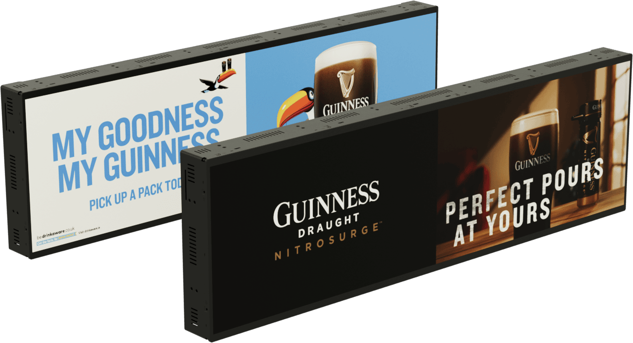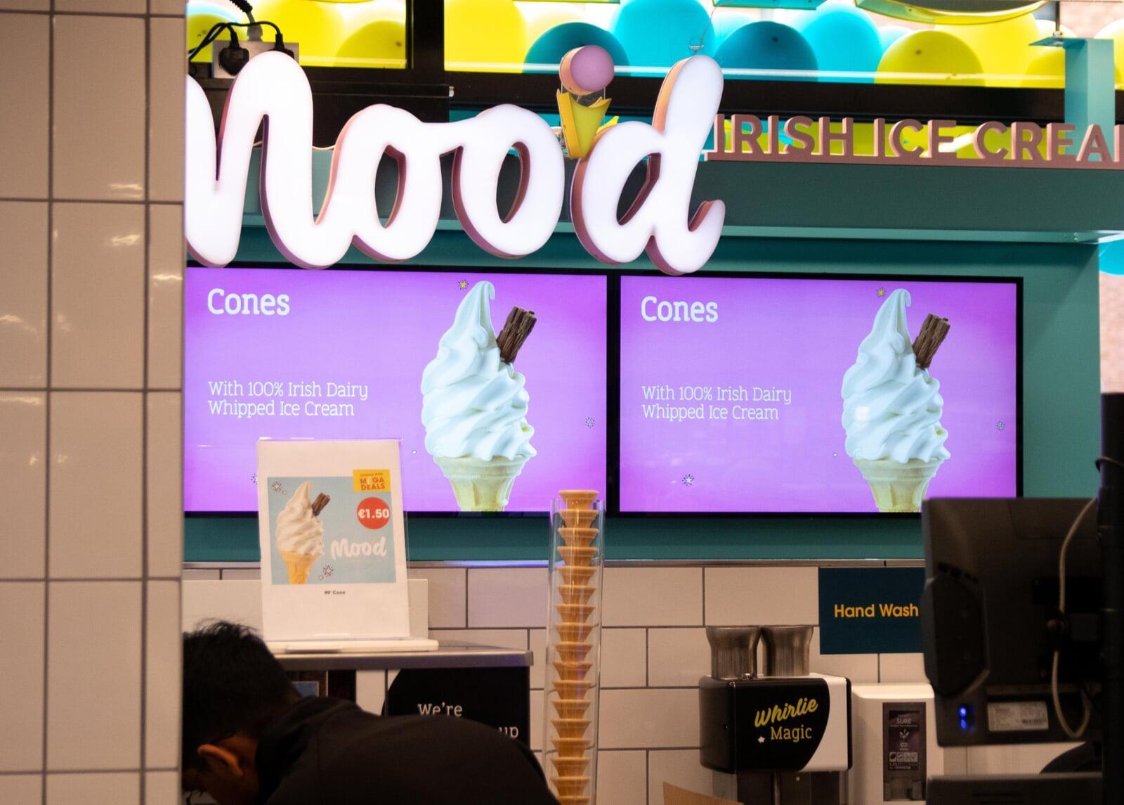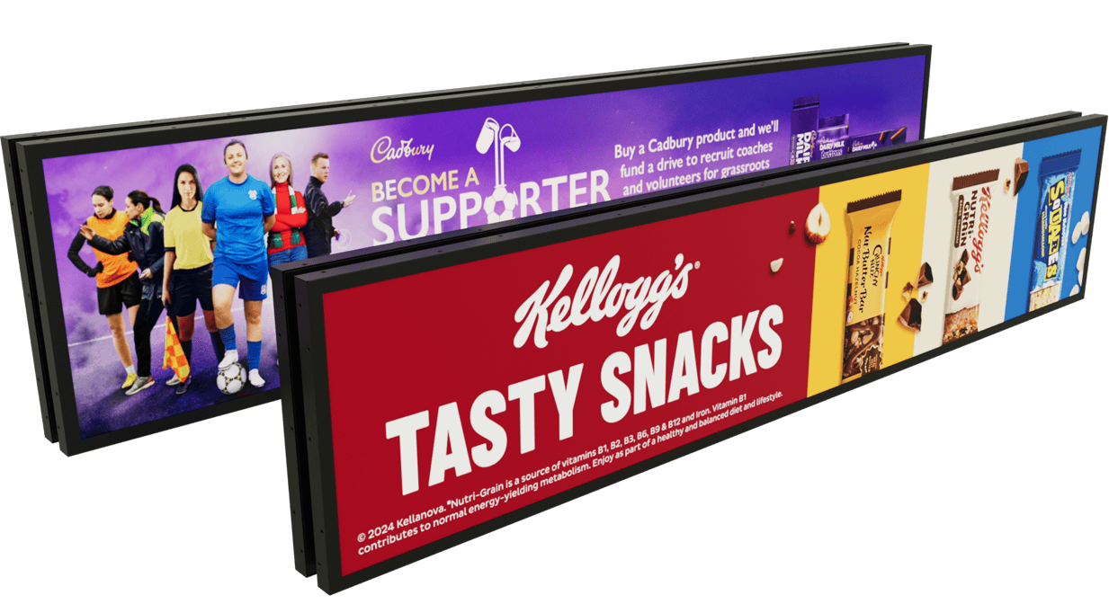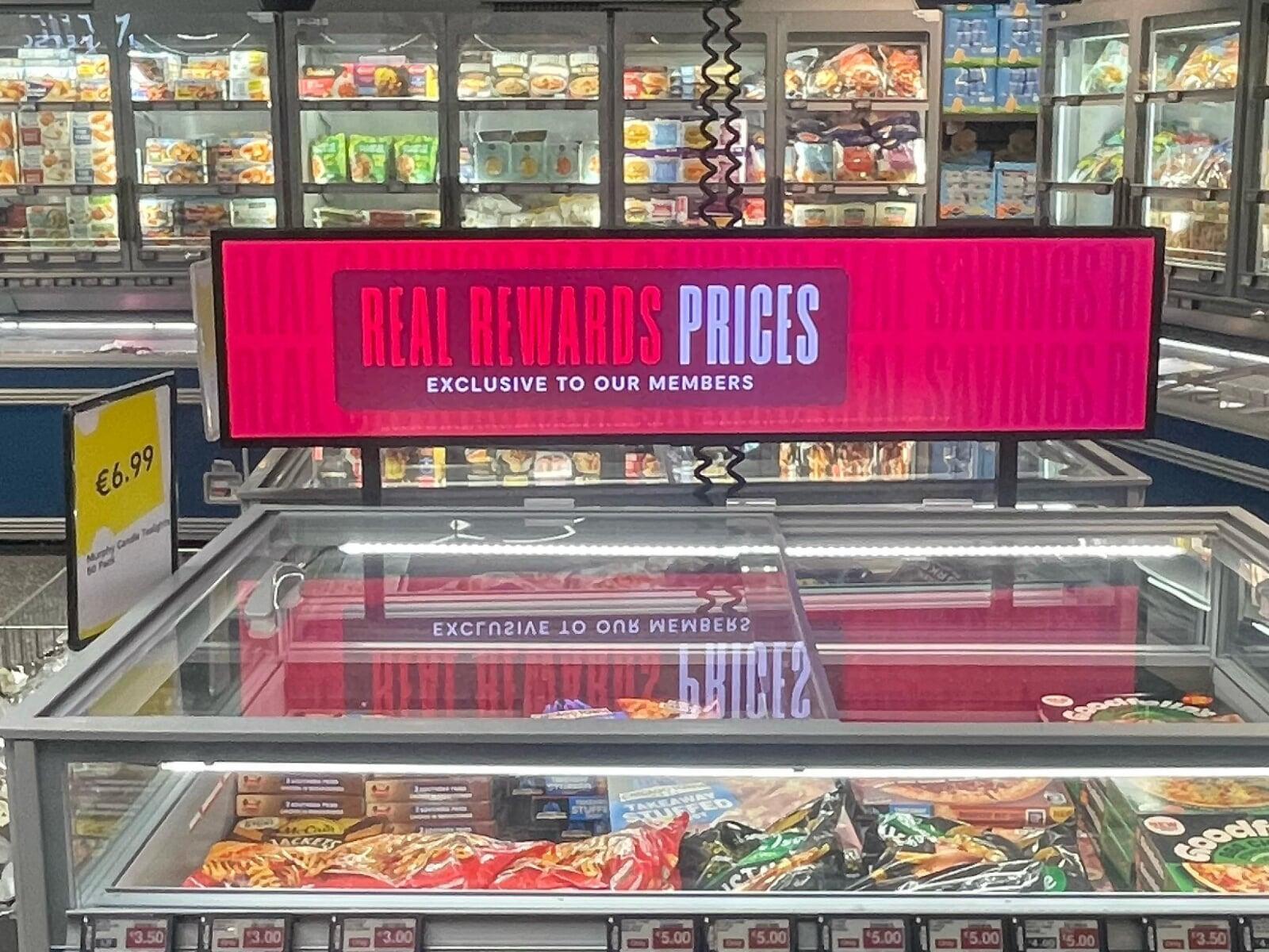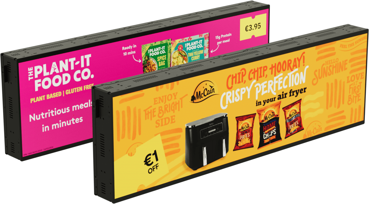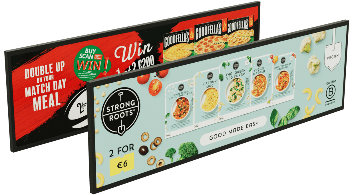 Dual-sided screens maximise visibility in high-traffic aisles, driving engagement with frozen product promotions.